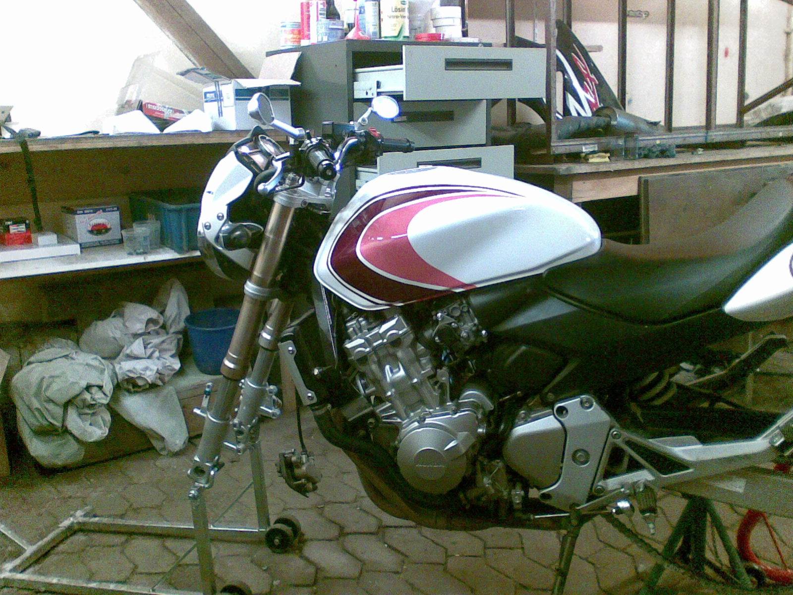 Hier ist die Hornet nun fast fertig gestellt. Sie bekam eine ZXR 400 Upside-Down Gabel inklusive Vorderrad und Bremse. Der Lack ist Purple Haze Effekt mit Pink auf Reinweiß.