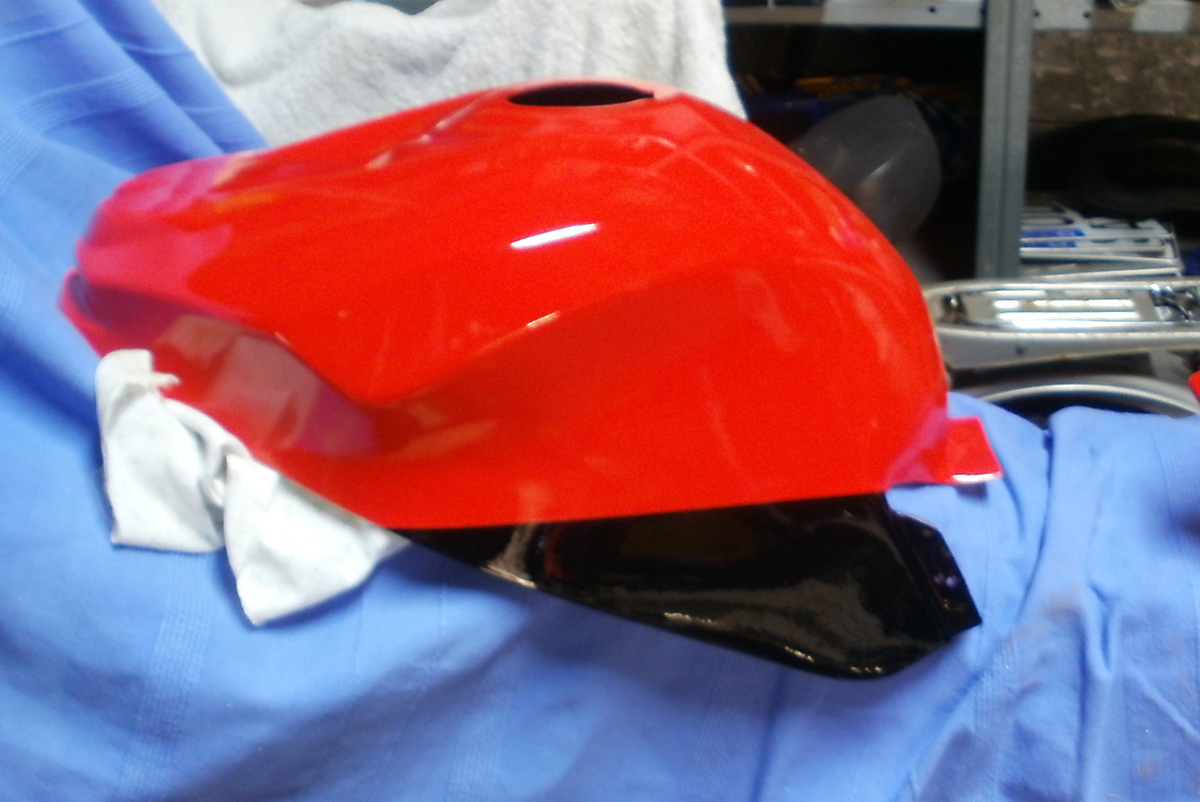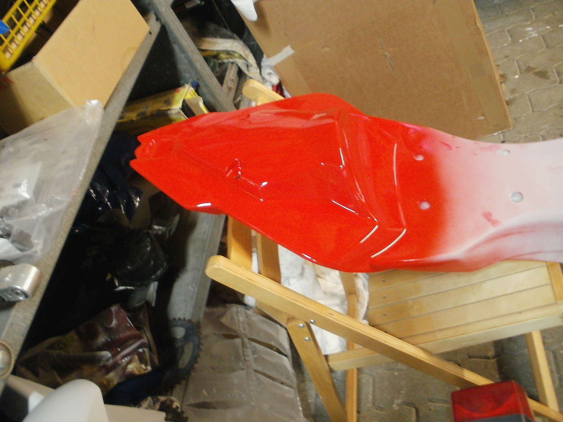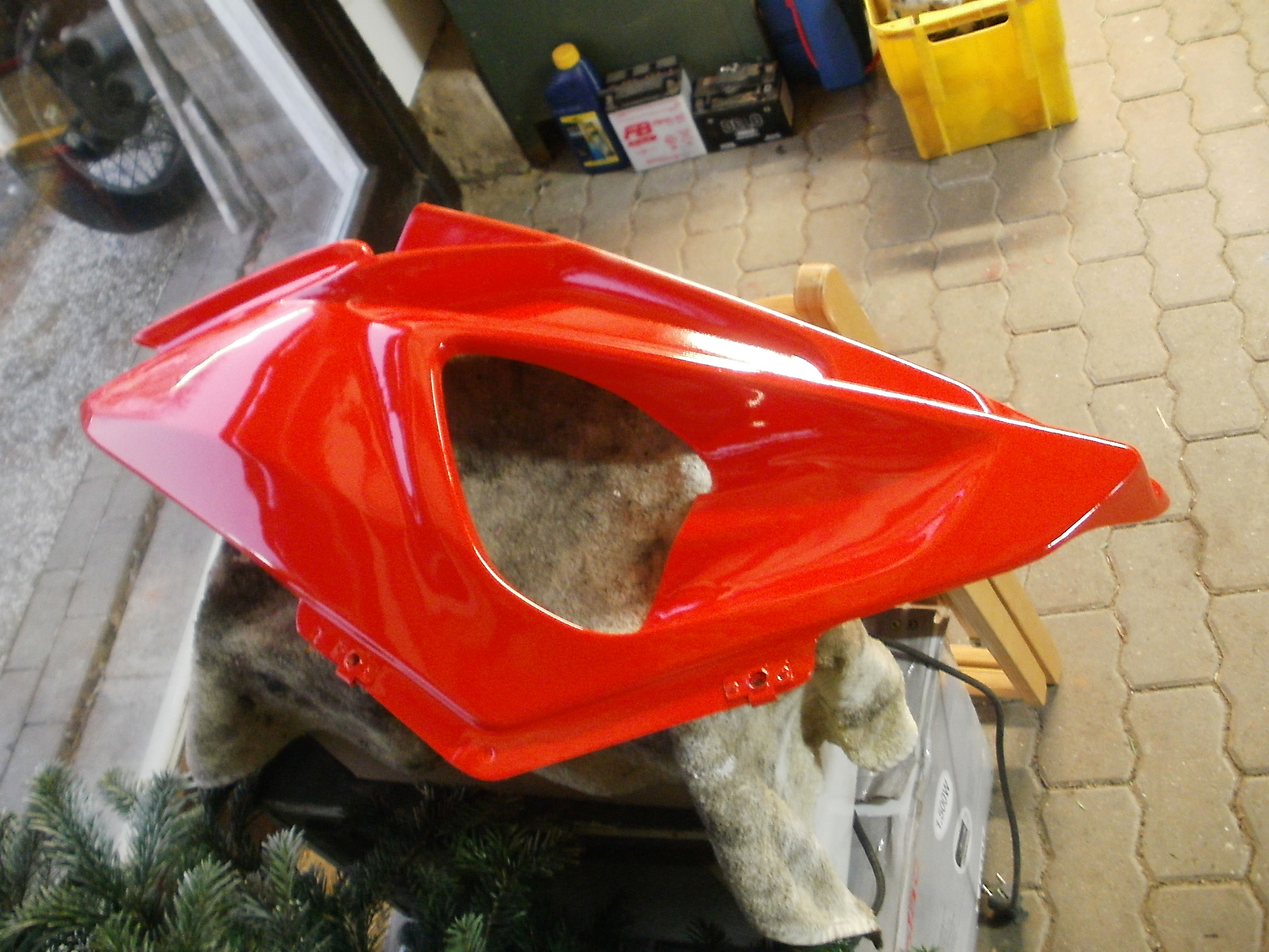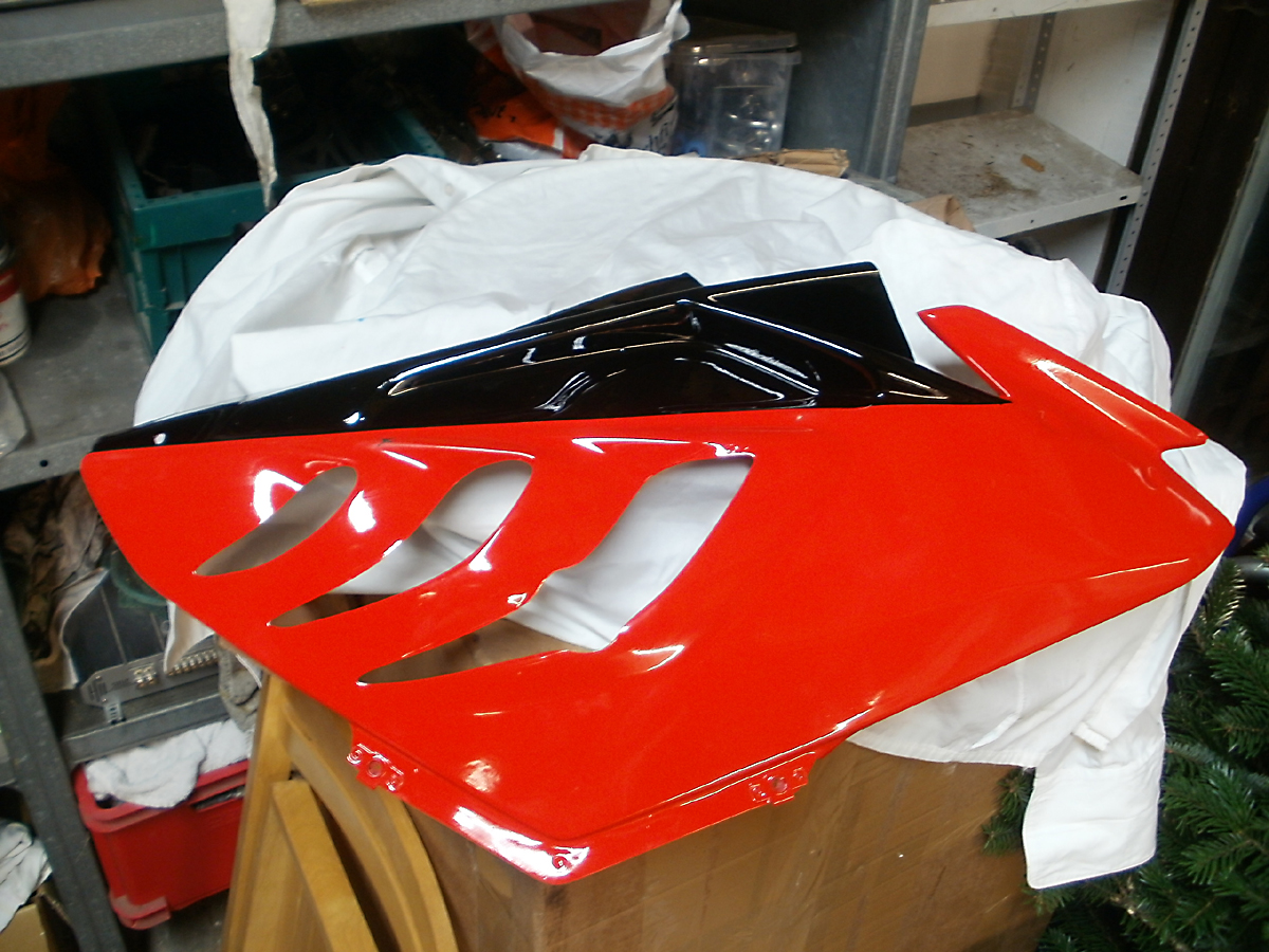 Die Verkleidung war bereits durch den Kunden angepasst. Also folgten die üblichen Vorarbeiten wie Schleifen und Grundieren. Hier die fertige Lackierung in Rot / Schwarz.